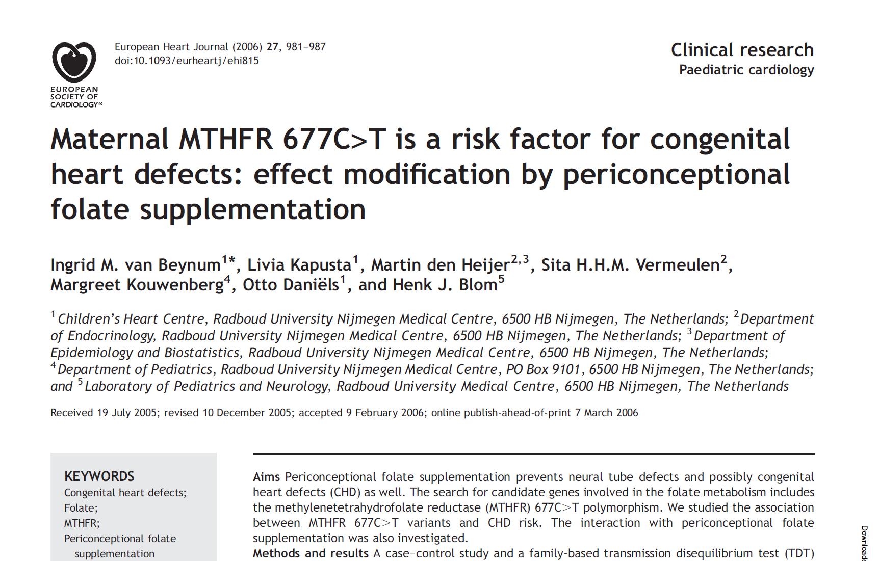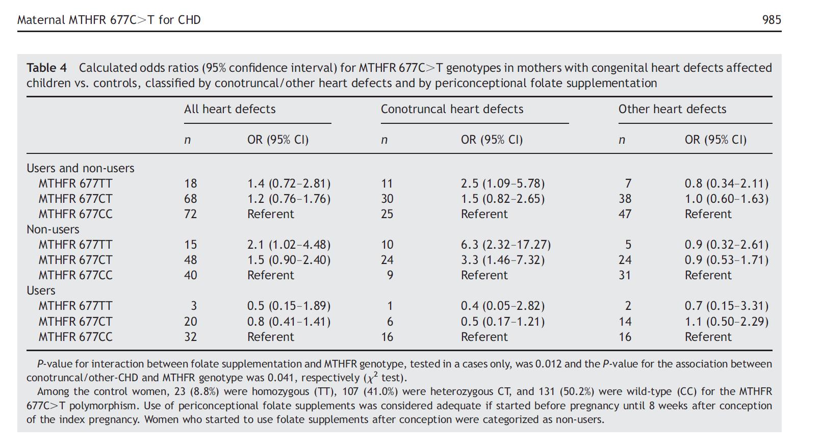 Blant 165 familier med medfødt hjertesykdom (CHD) og 220 kontrollfamilier, mødre som bar MTHFR 677 CT eller TT genotype og ikke hadde tatt perikonsepsjonelle folattilskudd var langt mer sannsynlig å få et barn med hjertefeil (OR 3,3 og 6.3, henholdsvis).