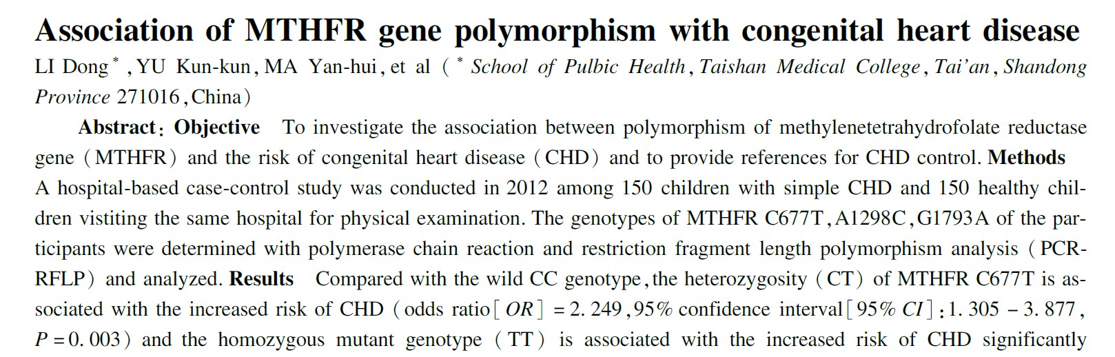 En studie fra Qilu barnesykehus i Shandong Universitetet viste at T-allelen til MTHFR C677T øker CHD odds 1,8 ganger; TT- og CT-genotyper øker risikoen til 3,1 ganger og 2,2 ganger.