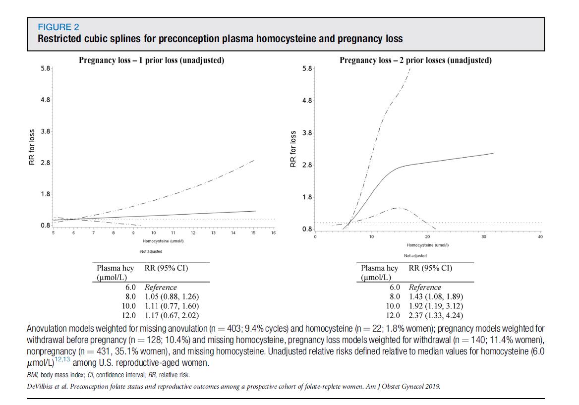 · En klar doseavhengig sammenhengmed homocystein (Hcy): blant kvinner med to tidligere tap, hver 2µmol/L økning i Hcy (f.eks. fra 6 µmol/L til 8 µmol/L) var assosiert med en43 % økning i spontanabortrisiko.