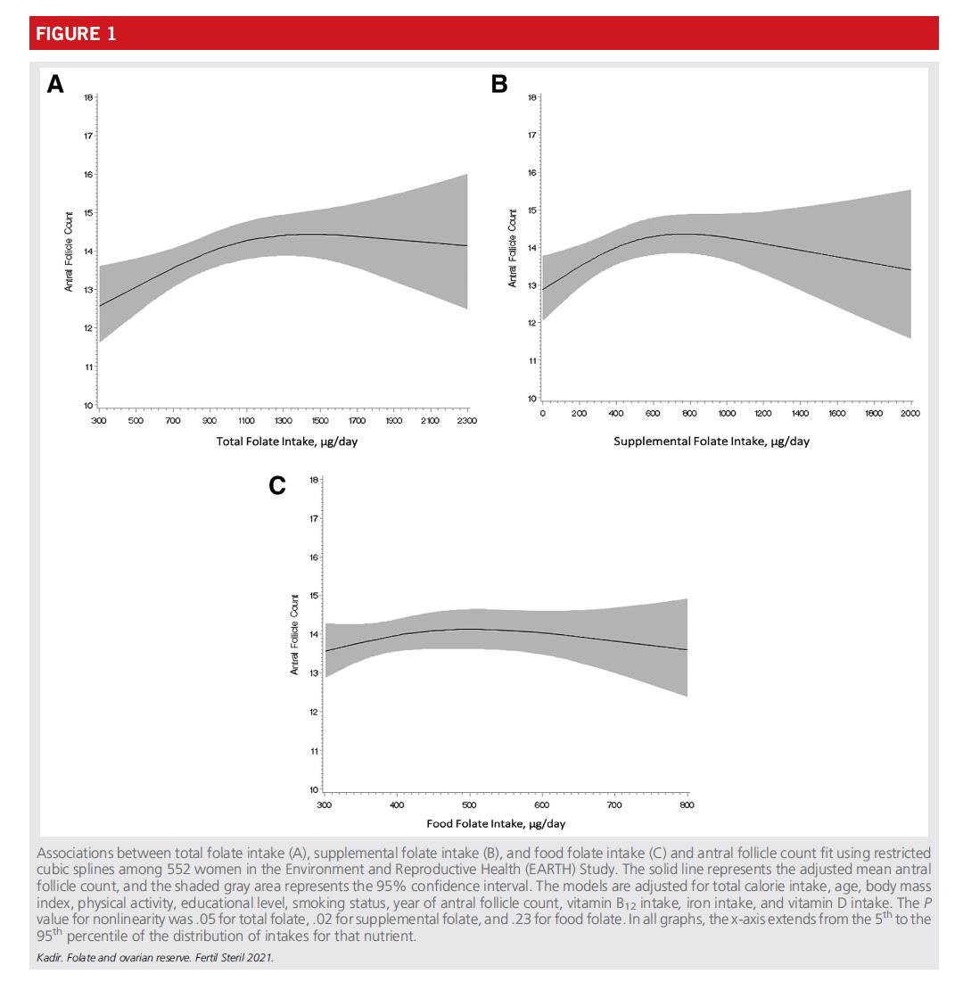 Dataene indikerte at den positive korrelasjonen mellom totalt folsyreinntak og AFC når et platå på ca1200 mikrogram per dag. Den største fordelen for folsyreinntak fra kosttilskudd (Folsyre, syntetisk folsyre) forekommer ca800 mikrogram per dag. Sammenlignet med kvinner med en daglig inntak av 400 mikrogram folsyre, de som bruker 800 mikrogram per dag forventes å ha en økning på ca1,5 follikler.