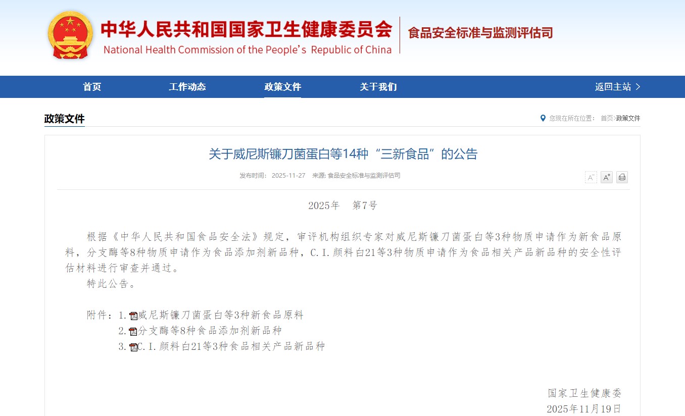 [1] Folkerepublikken Kinas nasjonale helsekommisjon.Kunngjøring på 14 "tre nye matvarer" inkludert venetiansk fusariumprotein (2025, nr. 7).