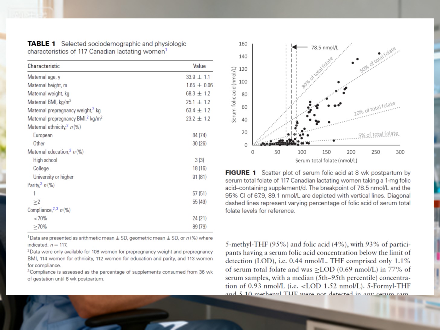 Studien inkluderte 117 friske ammende kvinner. Fra midten av svangerskapet videre tok de 1000 μg folsyre pluss 12 μg vitamin B₁₂daglig, fortsetter til 8 uker etter levering. Blodprøver samlet 8 uker etter fødselen ble analysert for folatformer.